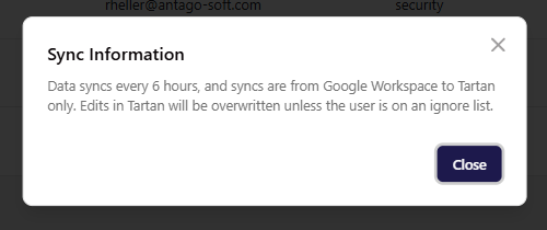 - Syncs are one-way only (Google Workspace → Tartan)