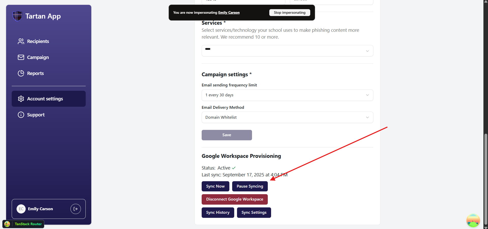 You can manage your Google Workspace connection from Account Settings under the Google Workspace Provisioning section (located below Campaign Settings).