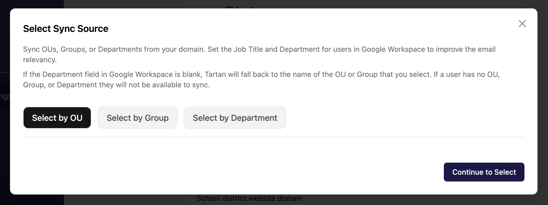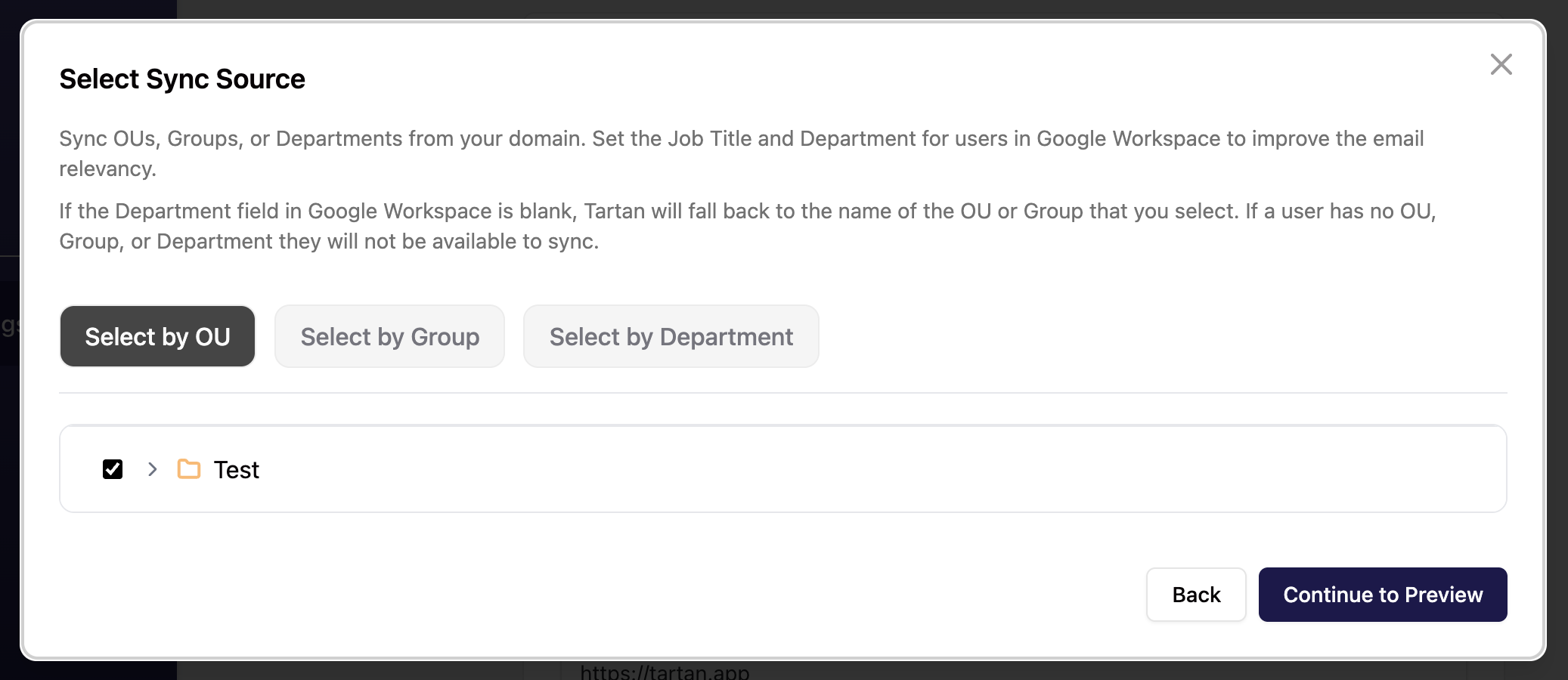 If the Department field in Google Workspace is blank, Tartan will fall back to the name of the OU or Group that you select. If a user has no OU, Group, or Department they will not be available to sync.