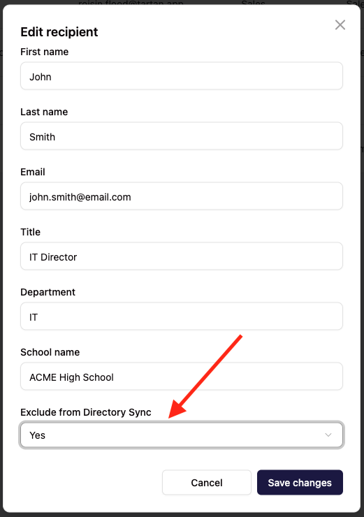 Manual edits will be overwritten during the next sync unless you add the recipient to the ignore list. To protect a recipient from sync overwrites, import them via CSV with exclude_from_directory_sync = true in the ignore column.
